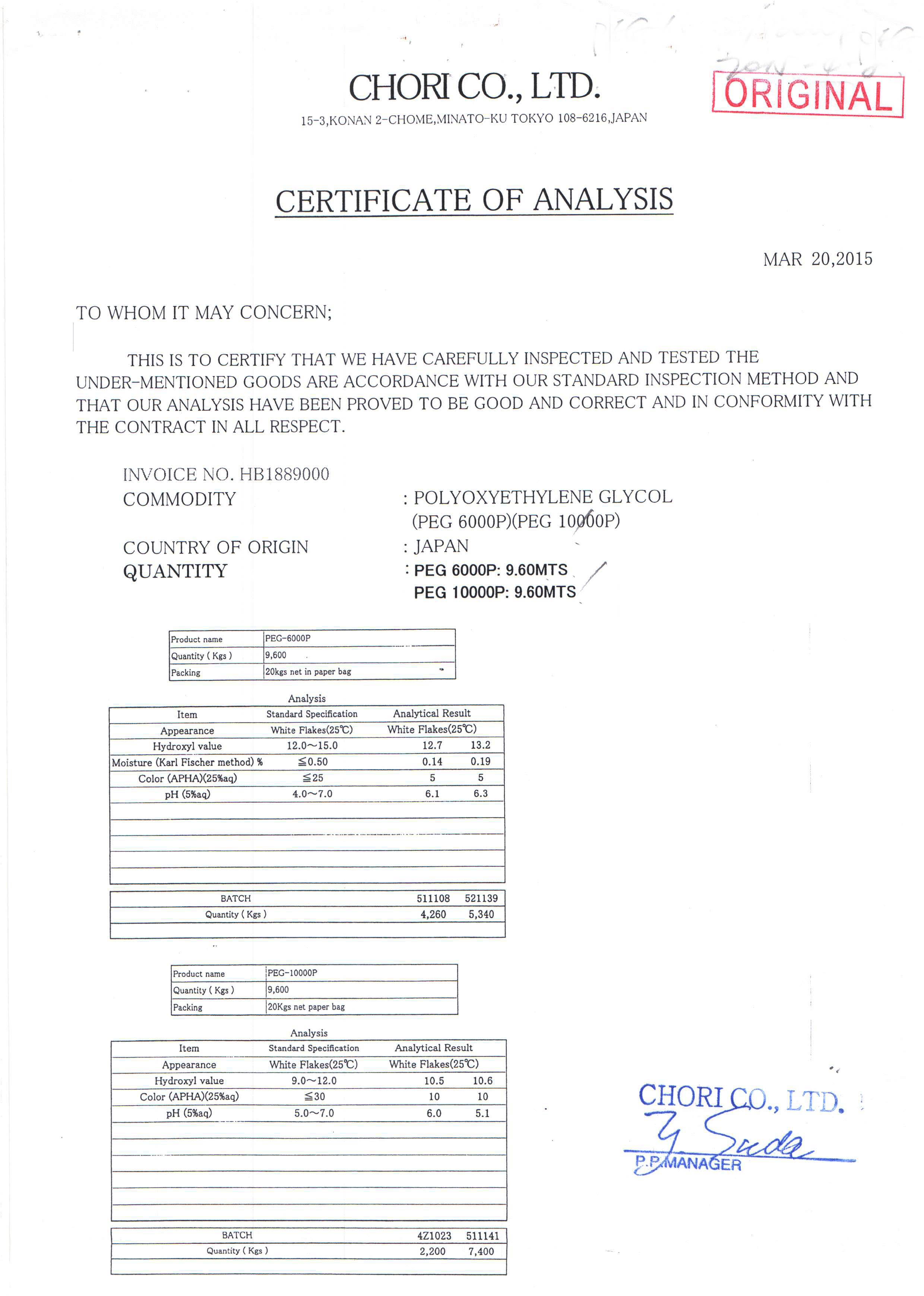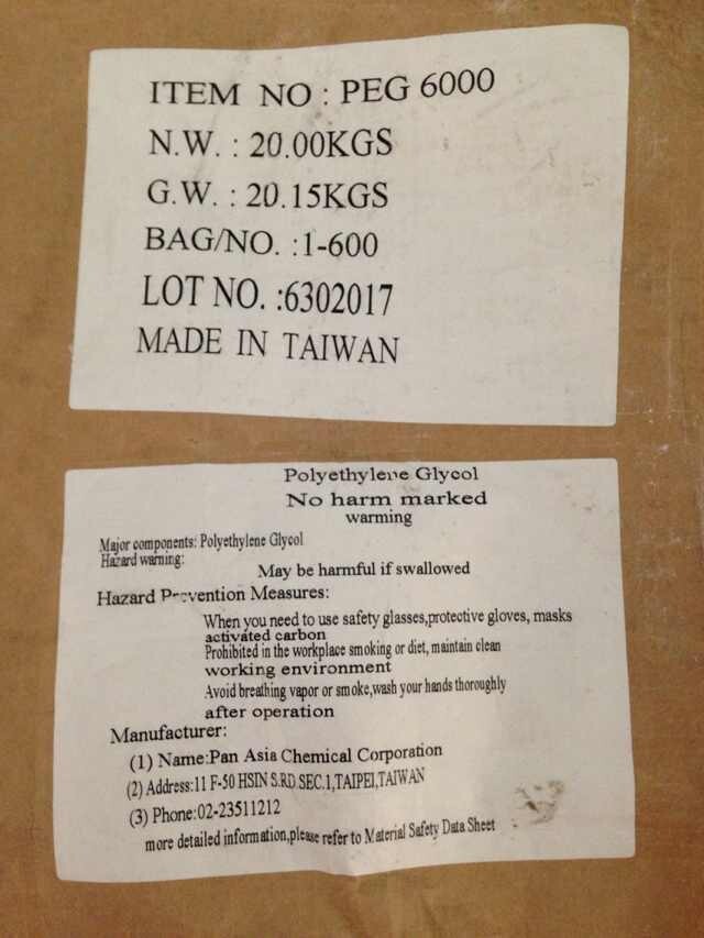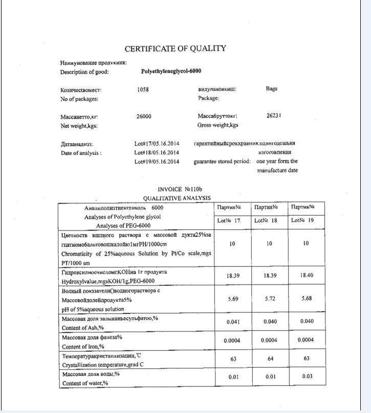 中文名称:聚乙二醇6000 含 量: 99.5%