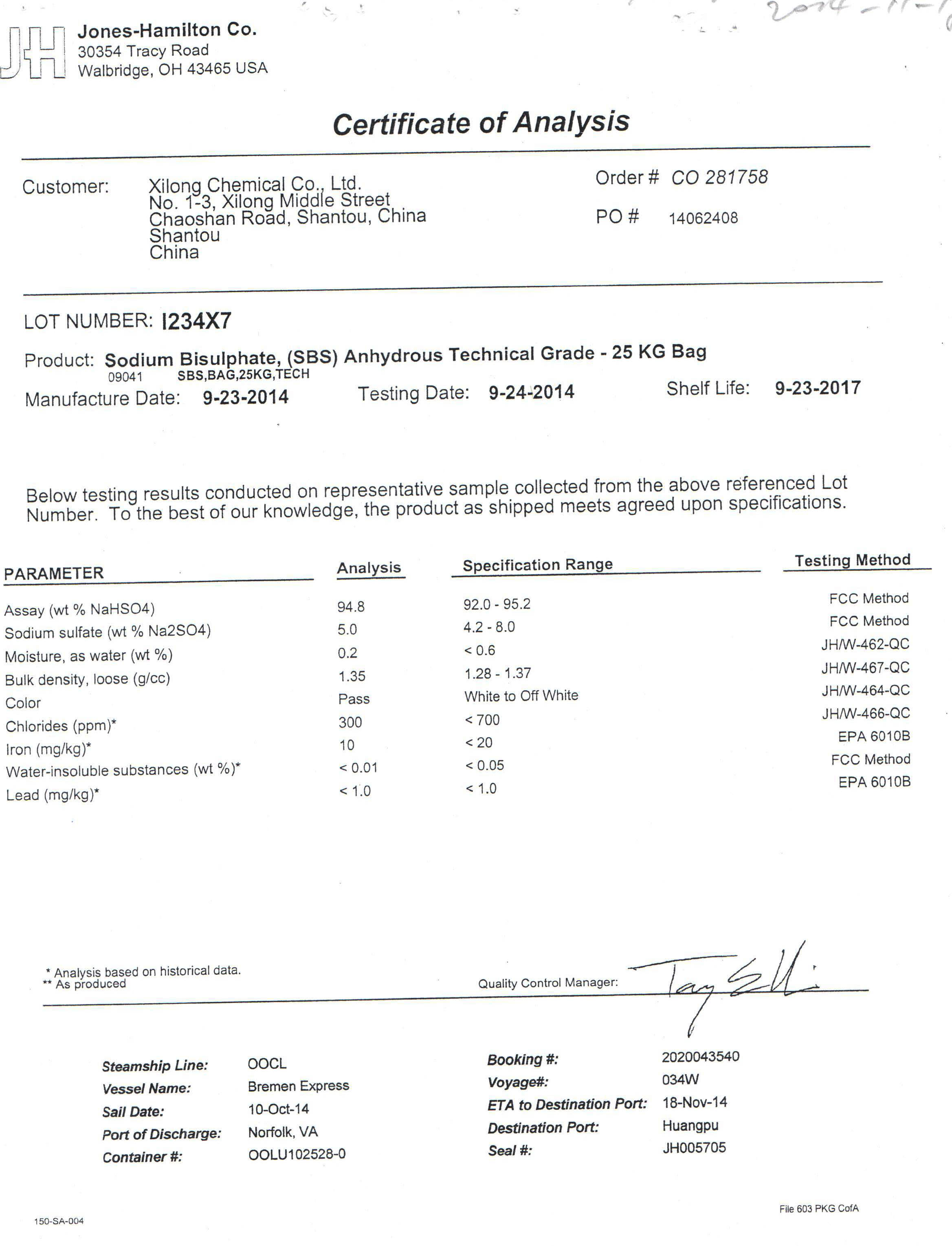附硫酸氢钠COA: