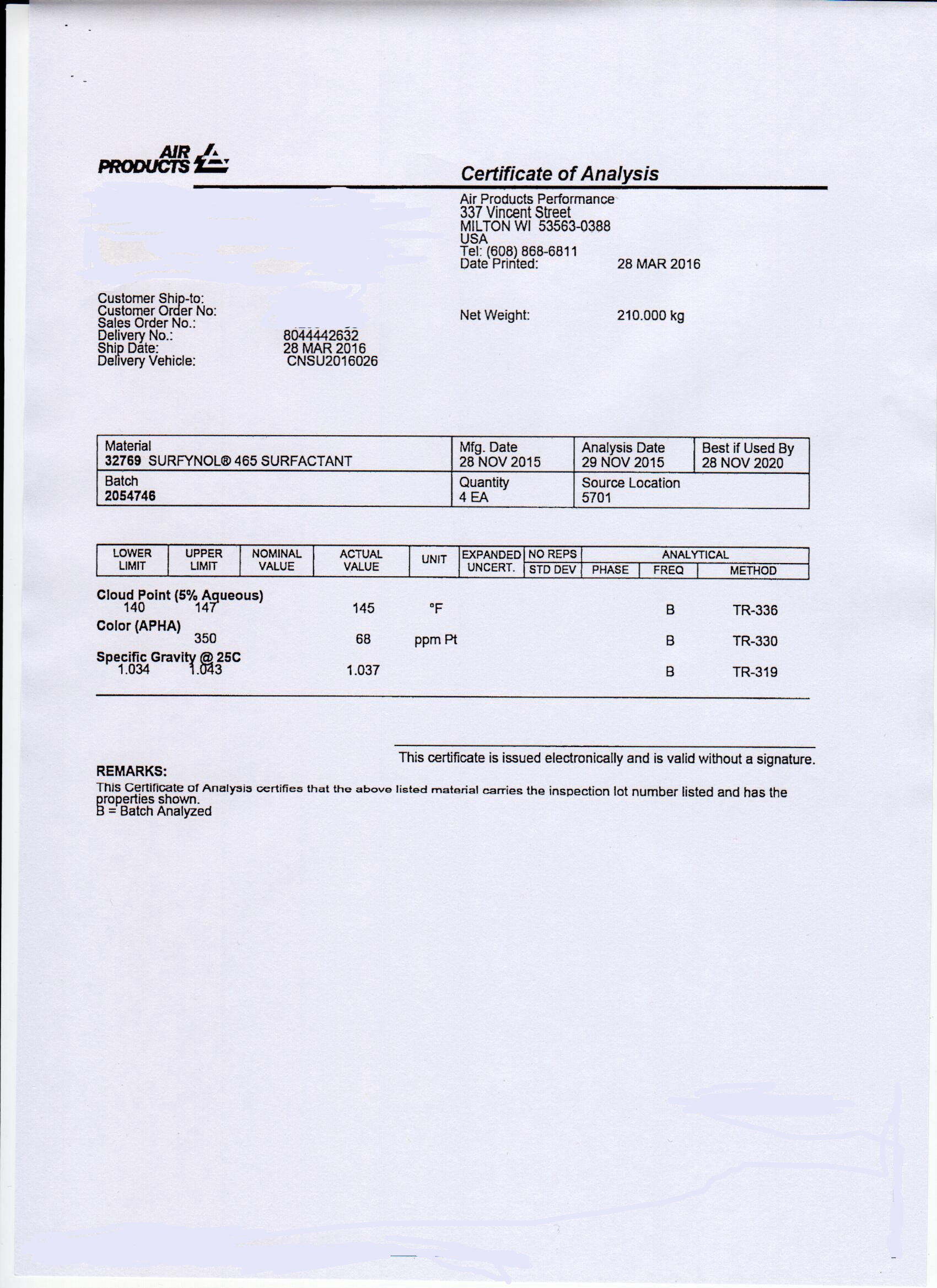 包装:每桶210公斤          产地:美国气体化学