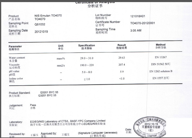 商品名称:非离子表面活性剂 TO-4070    包装:每桶200公斤